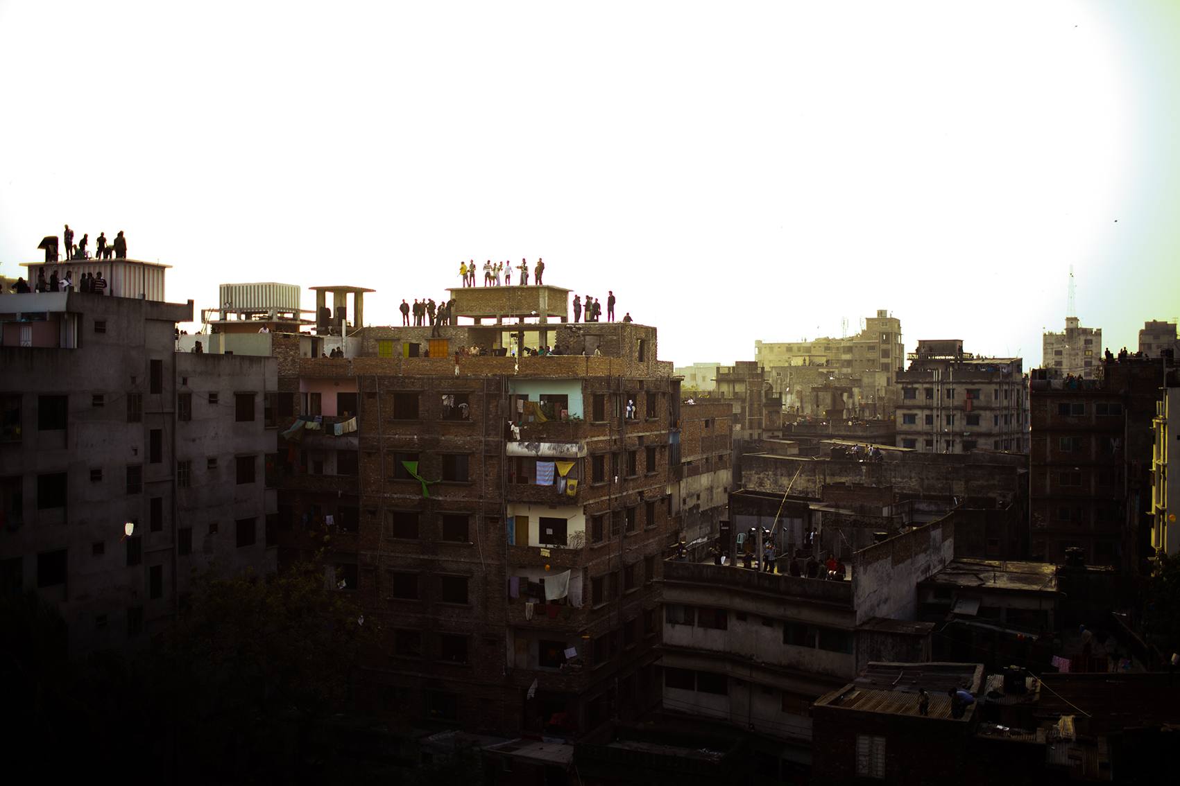 15th Jan 2012. Old Dhaka, Dhaka, Bangladesh. Cityscape of Old Dhaka with people standing on the roofs of buidlings and raising kites in the air. The kite festival is a Hindi festival. Raising the kites is a symbol for wellcomming the Spring Photograph by Evi Lemberger/Drik…