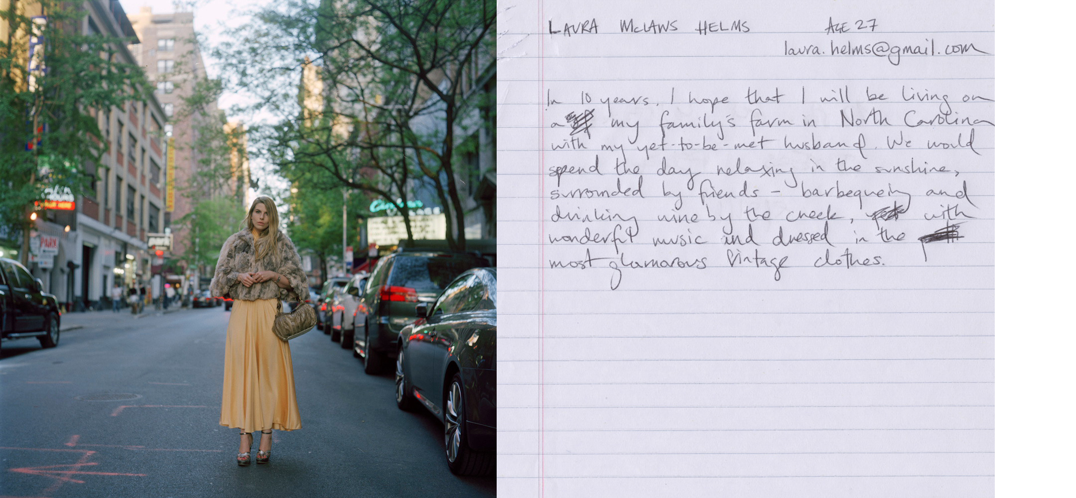 Laura McLaws Helms, New York City. Laura McLwas Helms standing on 11th Avenue between 4th and 5th Avenue in May 9th 2011. Laura, 27 is living in New York because of her course. She is specialising in Fahsion in the 60s. Today she is goin to a nearby restaurant who were visting her. (Photograph: Evi Lemberger)…