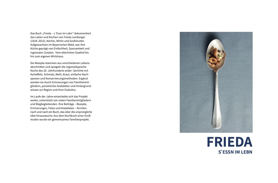 Buchdetails: Titel: Frieda – s’Essn im Lebn Herausgeberin: Evi Lemberger Autoren: Frieda Lemberger, Evi Lemberger, Rita Brandl, Josef Liebl ISBN: 978-3-00-083485-1 Preis: 24,90 € Erhältlich unter: evi.rita.lemberger@gmail.com 01605465434
