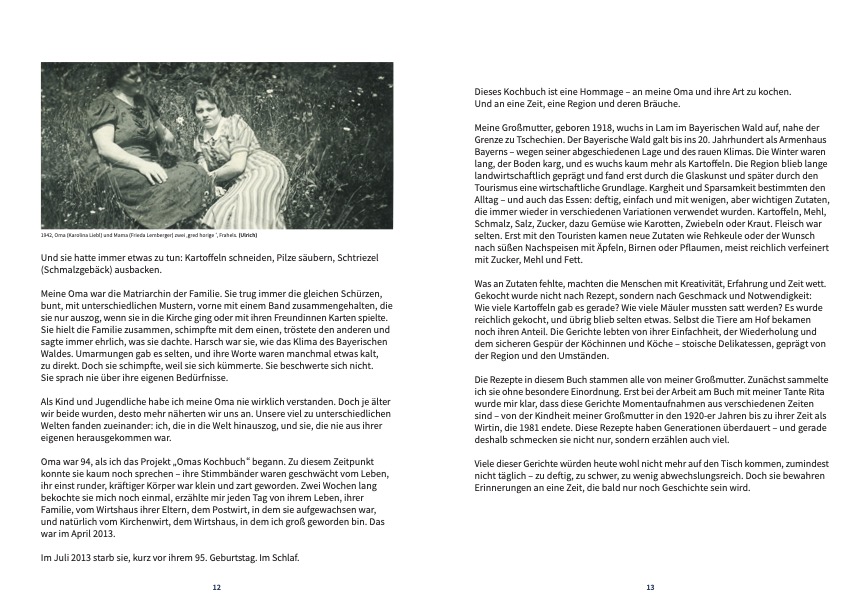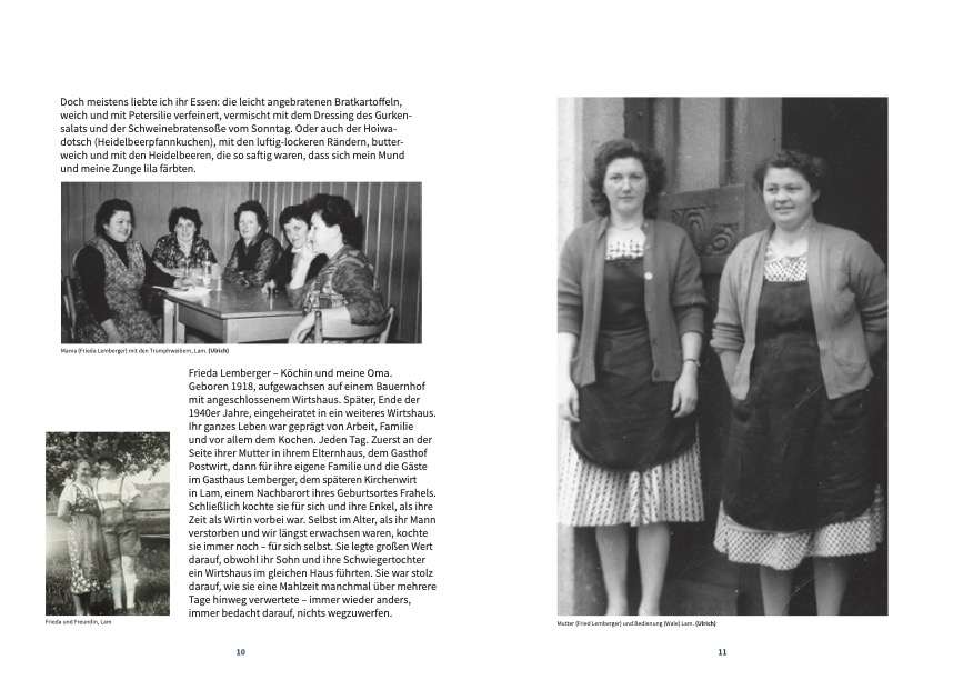 Im Frühjahr 2013 kochte Frieda Lemberger zwei Wochen lang täglich mit ihrer Enkelin, der Fotografin Evi Lemberger, und erzählte dabei aus ihrem Leben: von den beiden Wirtshäusern, die sie geprägt hatten, vom Alltag in Küche und Gaststube, von harter Arbeit und besonderen Momenten. Wenige Monate später, kurz vor ihrem 95. Geburtstag, verstarb sie – doch ihre Rezepte und Geschichten blieben lebendig.