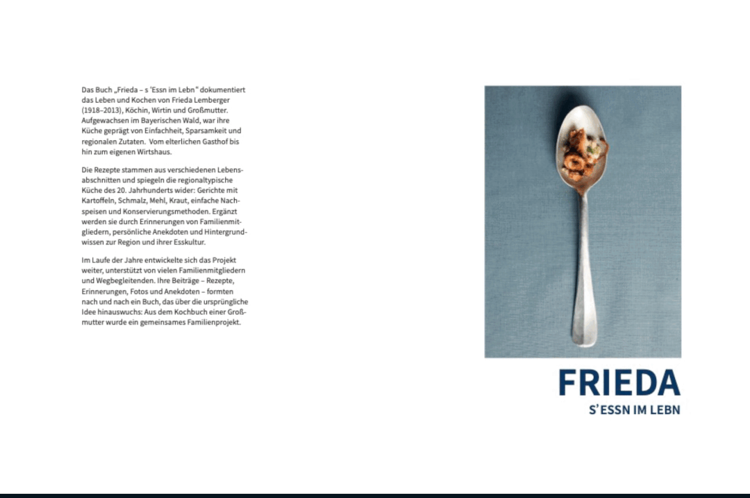 Mit stimmungsvoller Foodfotografie, historischen Einblicken und viel persönlicher Nähe ist „Frieda – s’Essn im Lebn“mehr als ein Kochbuch: Es ist ein Stück bayerischer Alltagsgeschichte und eine Einladung, die kulinarische Tradition weiterzutragen.